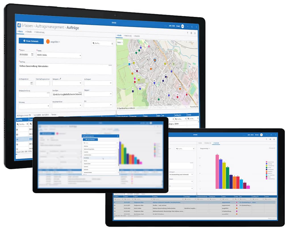 Angefragte Aufträge von Kunden oder vorgelagerten Sachgebieten werden einfach und schnell mit dem Modul des Auftragsmanagements inkl. Bild- und Dokumentationsmaterial an den Bauhof übermittelt. Alle wichtigen Informationen können sofort dem Verantwortlichen der Baustelle übergeben werden. Über die Erfassung von Tagesberichten können die erfassten Aufträge direkt abgerechnet werden.