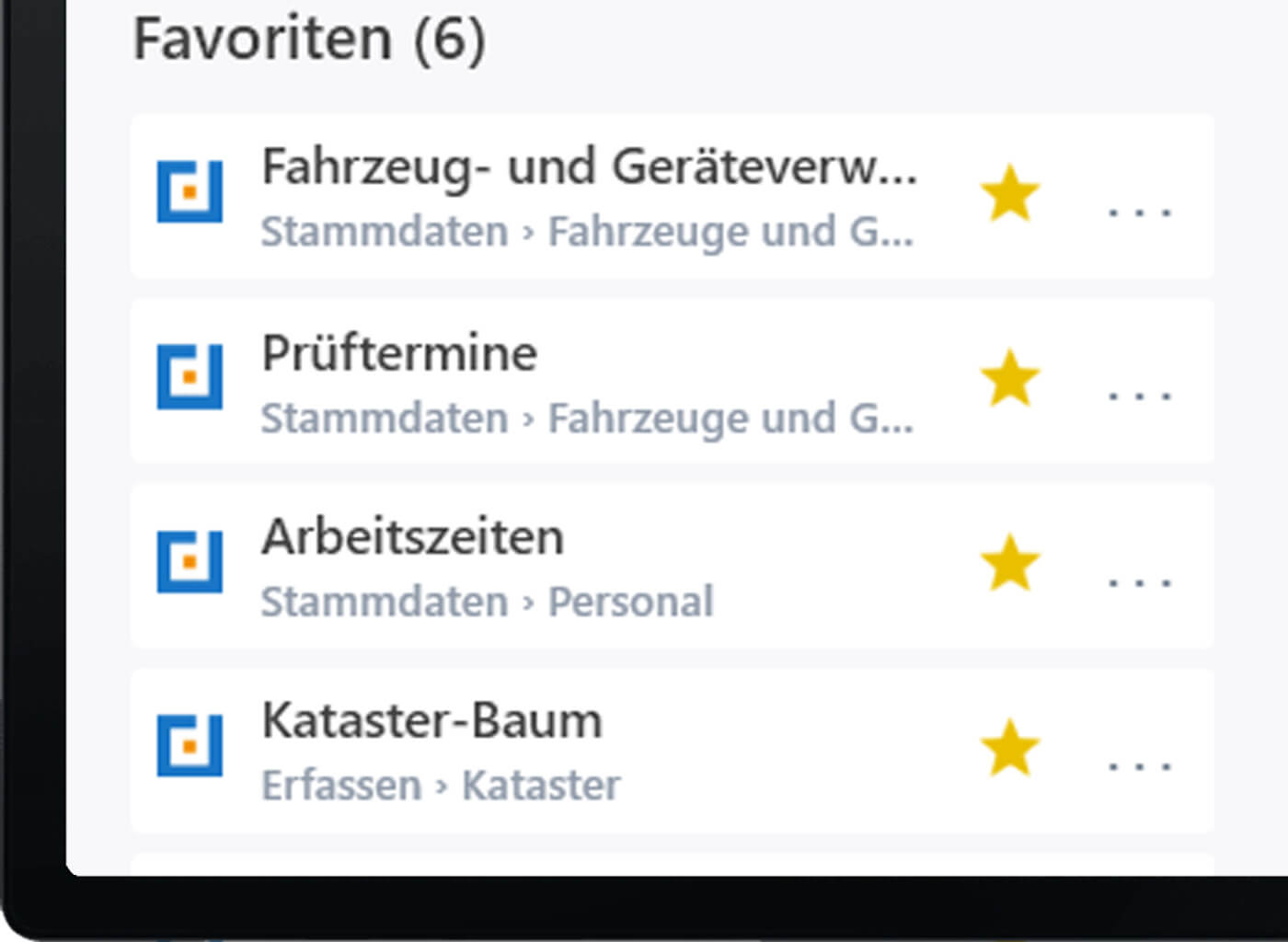 Alle Module können als Favoriten markiert und übersichtlich angeheftet werden. So behalten Sie wichtige Eingabemasken und Auswertungen jederzeit im Blick und haben schnellen Zugriff auf die Inhalte, die Sie am häufigsten nutzen.