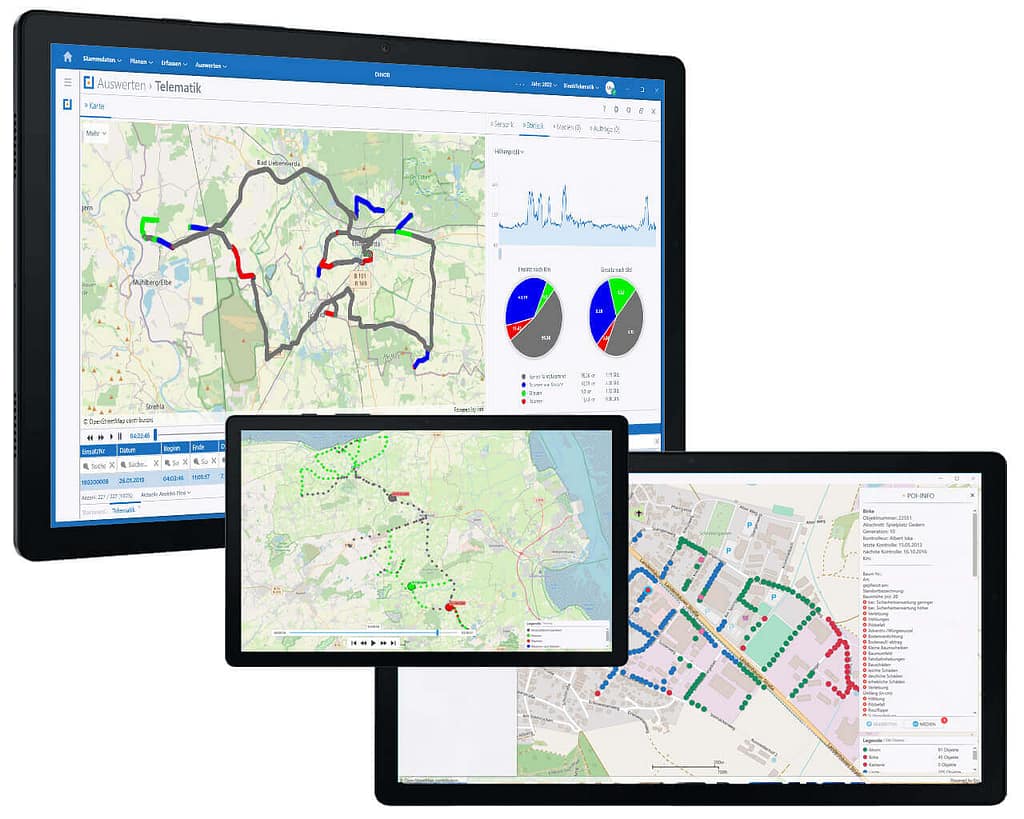 Zahlreiche Einsatzbereiche liefern ideale Daten zur übersichtlichen und grafisch animierten Darstellung im integrierten Kartenmodul.