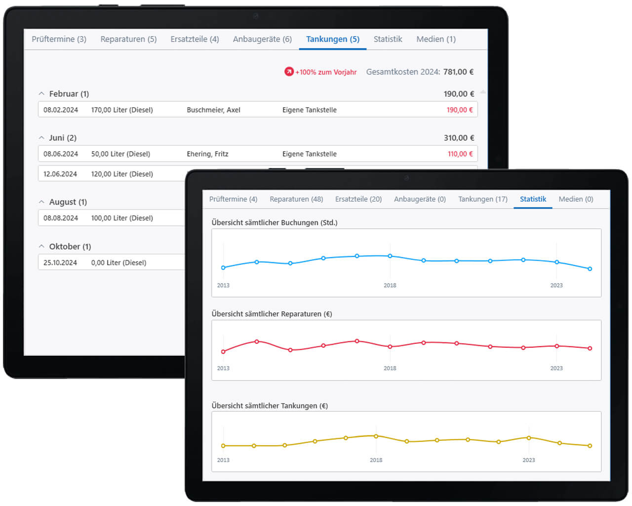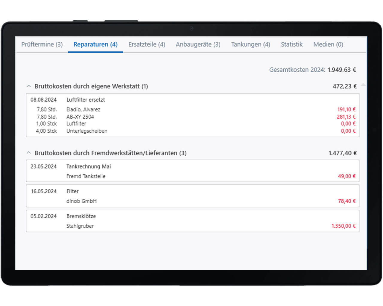 Die benutzerfreundliche Gestaltung ermöglicht schnellen und einfachen Zugriff auf umfassende Fahrzeugdetails, einschließlich aller Wartungsdaten, und unterstützt durch integrierte Schnellansichten und Statistiken eine gezielte und fundierte Entscheidungsfindung.